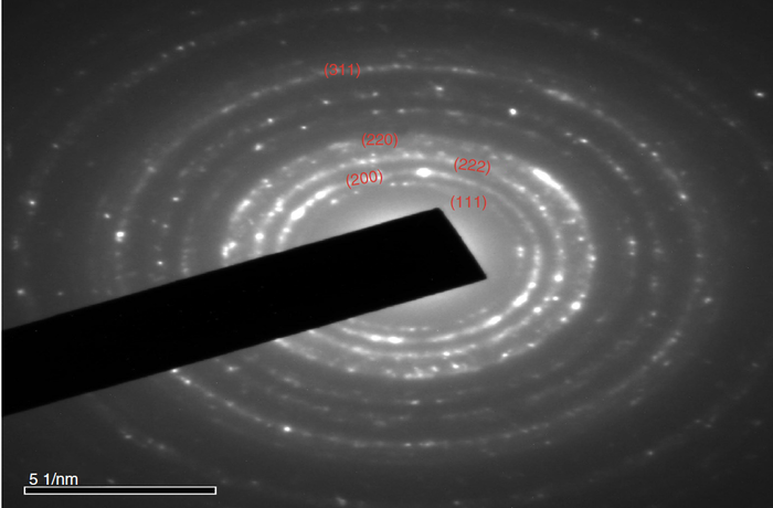 Figure 12 shows the selected area electron diffraction pattern (SAED) of the silver nanoparticles synthesized using carica papaya peel extract as reducing agent. The ring patterns indicate that the particles are crystalline in nature. Each ring corresponds to the different lattice planes obtained from the XRD analysis.