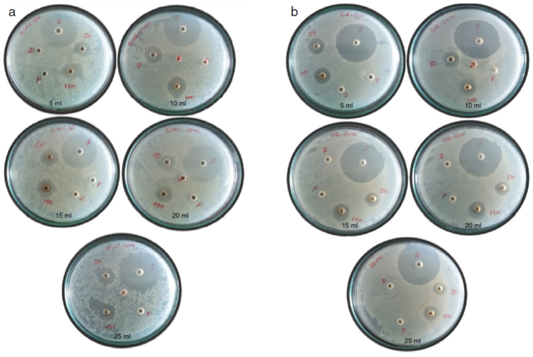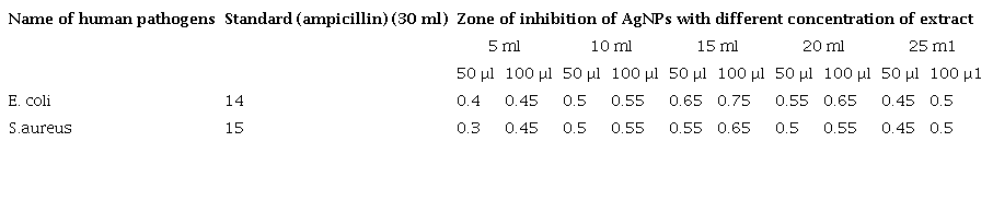 The inhibition zones for the silver nanoparticles with different concentrations of papaya peel extract are listed in Table 2. Ampicillin is used as a standard antibiotic to compare the results with the zone obtained using silver nanoparticles. The zone obtained using 100 ml of silver nanoparticles is greater than the zone formed using 50 ml of silver nanoparticles. It is observed from Figure 13 that, increase in the concentration of silver nanoparticles will result in the formation of a well defined inhibition zone. It is evident from Table 2 that the inhibition zones for both the bacterial strains depend on the concentration of papaya peel extract. A gradual increment in the diameter of the inhibition zone is observed for silver nanoparticles prepared using 5 ml, 10 ml and 15 ml concentrations of papaya extract. This may be due to the increase in the concentration of silver nanoparticles in the reaction mixture. Further, increase in the concentrations of the peel extracts to 20 ml and 25 ml, the diameter of the inhibition zone obtained for E. coli and S. aureus strains get decreased. The decrease in the diameter of the inhibition zone for high concentration peel extract silver nanoparticles may be due to the presence of low concentration of silver nanoparticles in the reaction mixture. It is confirmed that the antimicrobial activity of silver nanoparticles strongly depends on the concentration of the silver nanoparticles present in the reaction mixture. The anti microbial activity for gram negative bacteria is greater than that for gram positive bacteria for all the concentrations of peel extracts (Banala, Nagati, & Karnati, 2015; Ibrahim, 2015; Saravanakumar et al., 2017). It is further evident that the best results have been achieved in our study, that the zone of inhibition has been found to be 0.75 cm (75 mm) for E. coli and 0.65 cm (65 mm) for S. aureus for 100 ml is very much higher than that reported by Kokila et al. as 15 mm for E. coli and 10 mm for S. aureus in their study.