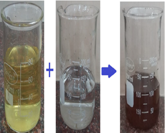 About 5 ml of filtered bio peel extract is taken and added into 1 mM of pure aqueous silver nitrate solution and stirred for an hour for the reduction of silver nitrate into silver nanoparticles. The reduction process Ag+ to Ag0 nanoparticles is followed by the colour change of the solution from yellow to brownish-yellow to deep brown depending on parameters studied such as the extract concentration. The formation of brown color confirms the syntheses of silver nanoparticles are completed. A similar method is followed for the preparation of silver nanoparticles by using various concentrations of the carica papaya peel extract (Fig. 2).