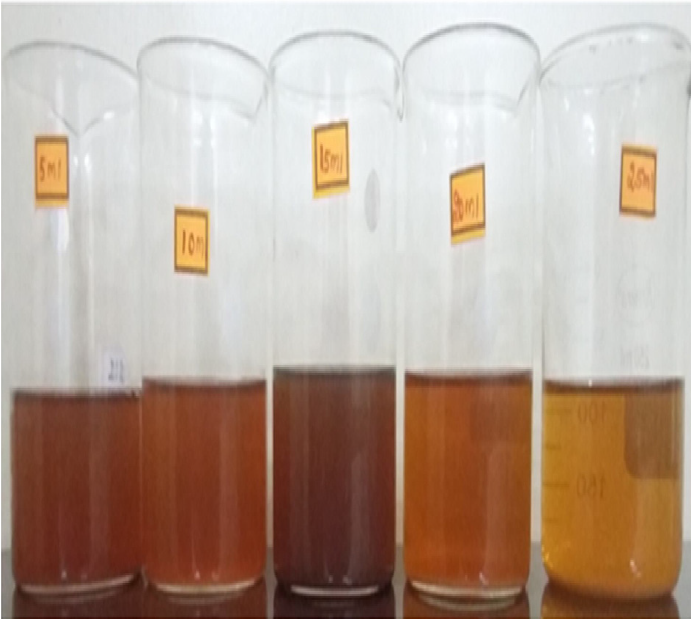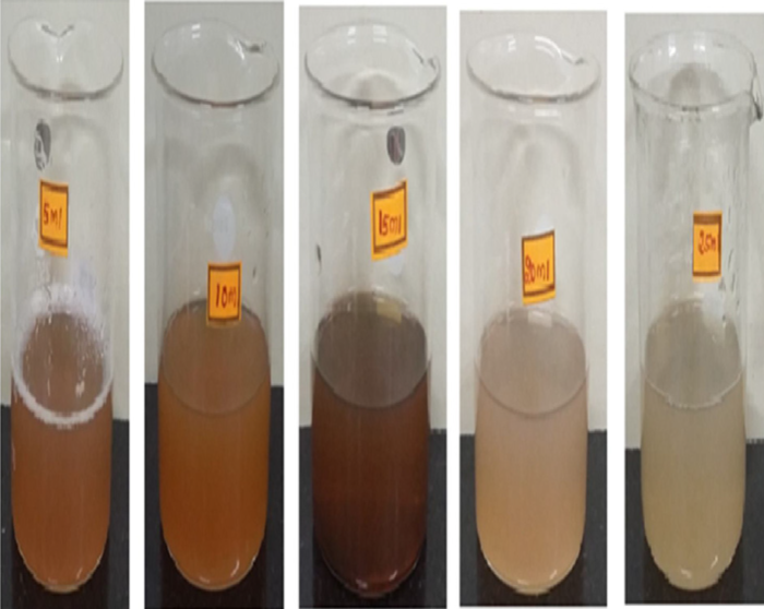 Figure 3 (a-e) shows the mixture of synthesized silvernanoparticles using papaya peel extracts of various concentrations (5 ml, 10 ml, 15 ml, 20 ml and 25 ml). The colour of thereaction mixture after 1 h from the initiation of the reaction is different for different concentrations of carica papaya peel extractas evidenced from Figure 3. The colour of the reaction mixturefor the 5 ml concentration of papaya peel extract shows a reddishbrown colour, which increases with increase in the peel extractconcentration from 5 ml to 25 ml.