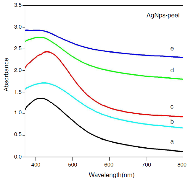 From Figure 5, it is also observed that the absorption peak wavelength of AgNPs shifts to the higher wavelength side as the concentration of the papaya peel extract increases from 5 to 15 ml, corresponding to the red shift. This red shift indicates a gradual increment in the mean diameter of the silver nanoparticles. It is further observed that, as the concentration of papaya peel extract increases to 20 and 25 ml, the absorption wavelength of AgNPs shifts to lower wavelength side corresponding to blue shift. This blue shift indicates a gradual reduction in the mean diameter of the silver nanoparticles.
