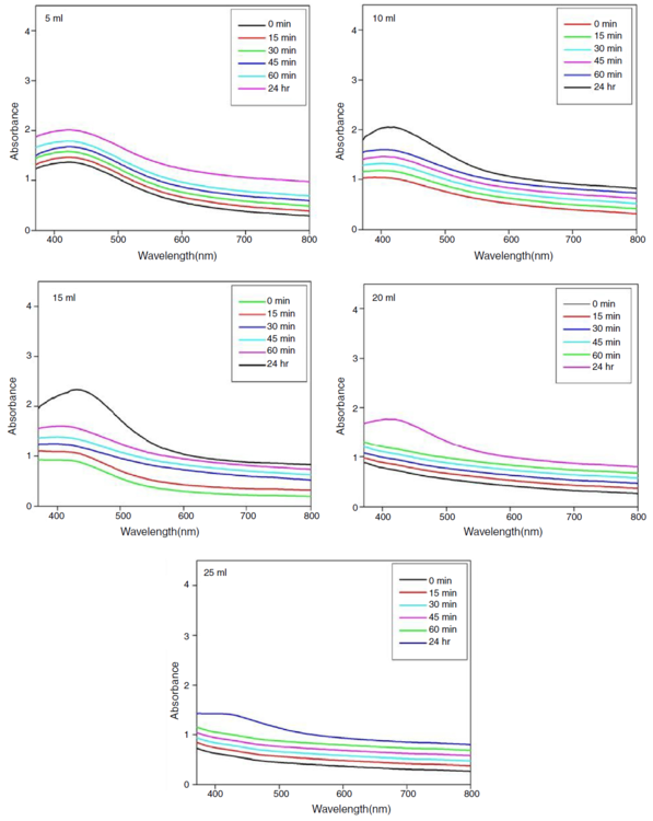 The time dependent UV-visible spectra of silver nanoparticles with different concentrations (5 ml, 10 ml, 15 ml, 20 ml, and 25 ml) of papaya peel extract is shown in Figure 6. The UV-visible spectra of silver nanoparticles are recorded after time intervals of 0 min, 15 min, 30 min, 45 min, 60 min and 24 h from the initiation of reaction. It is observed that the incubation period of the reaction mixture shows a gradual increase in absorbance spectrum with surface resonance Plasmon resonance band. It is observed that the absorption peak intensity is lower for 0 min of reaction time, which confirms that less number of silver nanoparticles is formed in the reaction mixture. The absorption peak intensity gradually increases with increase in the reaction time from 0 min to 60 min for all the concentrations of papaya peel extract, which indicates an increase in the concentration of silver nanoparticles in the reaction mixture (Mohapatra et al., 2015). The highest absorption peak intensity is observed after 24 h of incubation from the initiation of the reaction, which indicates the complete formation of silver nanoparticles in all the reaction mixtures.