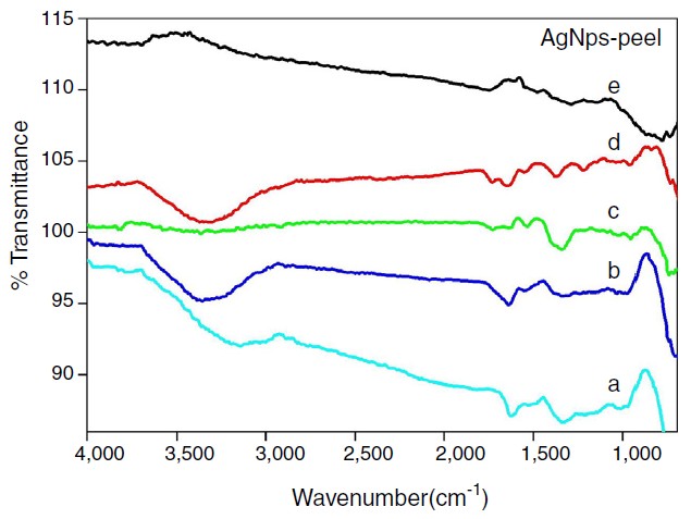 Figure 8 shows the FT-IR spectra of carica papaya peel mediated silver nanoparticles (AgNPs), for various concentrations (5 ml, 10 ml, 15 ml, 20 ml and 25 ml) of papaya peel extract. The FT-IR spectra show characteristic absorption bands bandsaround 700-750 cm−1, 950-980 cm−1, 1000-1150 cm−1,1200-1300 cm−1, 1330-1370 cm−1, 1500-1550 cm−1,1600-1650 cm−1and 3100-3400 cm−1. The bands around700-750 cm−1may be attributed to stretching vibrations of C-Cl alkyl halides (Khalil et al., 2014). The observed bands around 950-980 cm−1 may arise due to bending vibrations of =C-H group alkenes. The absorption band around 1000-1150 cm−1 may be assigned to C-O stretching vibrations of carboxylic acids. The bands around 1200-1300 cm−1 are associated with N-H bend amines (Sivakumar, Nethradevi, & Renganathan, 2012). The bands around 1330-1370 cm−1 may be due to C-N stretch amine group. The bands around 1500-1550 cm−1 correspond to N-O asymmetric stretch nitro compounds. The bands around 1600-1650 may correspond to stretching vibrations of primary and secondary amines (Khalil et al., 2014; Shanmugavadivu, Kuppusamy, & Ranjithkumar, 2014; Sivakumar et al., 2012). The bands around 3100-3400 cm−1may be due to C=O stretch of carboxylic acids (Khalil et al., 2014).