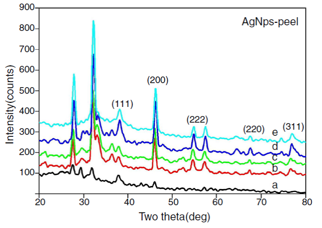 The XRD patterns of silver nanoparticles show five distinct peaks in the spectrum of 2θ value ranging from 30◦ to 80◦. The peaks are indexed with reference to the standard JCPDS card no. 04-783 for silver and are found to be (111), (200), (222), (220) and (311), corresponding to the cubic face of silver nanoparticles (Saravanakumar, Ganesh, Jayaprakash, & Jang, 2015). The peaks observed around 27◦ and 32◦ may due to the peel extract. These Braggs peak might have resulted due to capping agent, stabilizing the nanoparticles (Ibrahim, 2015; Roopan et al., 2013). The crystallite sizes of the silver nanoparticles using various concentrations of papaya peel extract are calculated using the Debye-Scherrer’s equation (Gnanajobitha, Rajeshkumar, Kannan, & Annadurai, 2013).