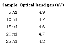 The optical band gap value for the various concentrations of carica papaya peel extracts are calculated and are listed in Table 1. The optical band gap decreases as the concentration of papaya peel extract increases from 5 to 15 ml, which confirms that the size of the particle increases and thereby the energy band gap decreases. On further increase in the concentration of papaya peel extract to 20 ml and 25 ml, the optical band gap is found to increase thereby confirming the decrease in the size of the silver nanoparticles for these concentrations, which could also be evidenced from XRD analysis (Ghobadi, 2013; Kamat, Meisel, Weller, & Eychmuller, 1996; Schön & Simon, 1995).