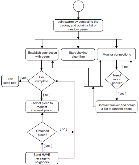 In Figure 1, a flow diagram with the overall operation of this protocol is shown. A peer that needs to join a swarm must have the corresponding torrent file in order to contact the tracker. Then, this latter receives a request from a peer and sends back a random list of IP and ports of other hosts that are part of the swarm. With this list of hosts, a peer establishes TCP connections with a sufficient number of them; these connected peers are known as neighbors. In parallel, two other processes take place: choking (Cohen, 2003) and connections monitoring; this link supervision is necessary to have a proper number of neighbors. Next, a peer evaluates constantly if it has a complete copy of the file, that is, all pieces have been received from other peers. If a peer is still missing pieces, an algorithm selects one and requests it to one of its neighbors. Once a piece is received, a HAVE message is sent to all neighbors to inform which piece is now available from that peer. After a peer obtains all pieces, its role is changed to seed.