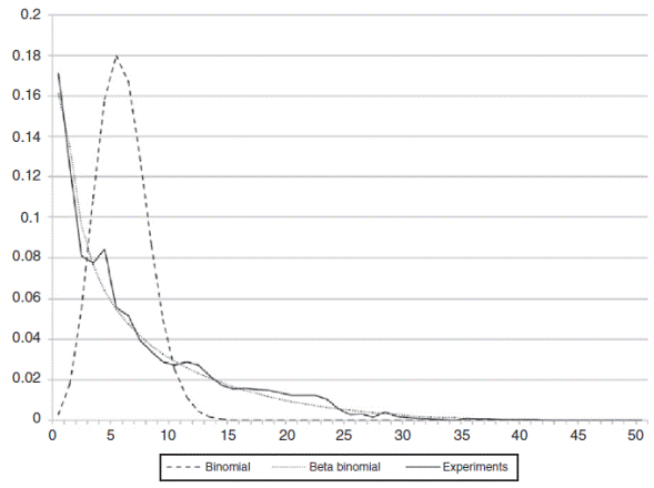where X¯ and S2 are the mean and variance respectively. With this information, we determined that the chi-square test passed at a 5% significance level and 50 degrees of freedom when compared against simulation results for our platform. The probability density functions can be seen in Figure 11, results for Binomial, Beta Binomial and our experiments are shown.