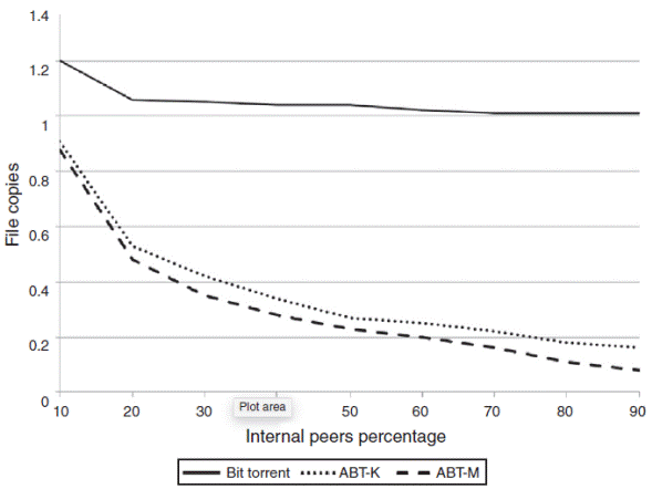 Also, notice that bandwidth utilization for ABT-K and ABT-M are much less than BT, although ABT-M performs better. Remarkably, for 90% of internal peers this value is 0.08 for ABT-M, meaning that only 8% of the required bandwidth is used when compared to any centralized approach, or even to the use of a content distribution network (Katsaros et al., 2009).