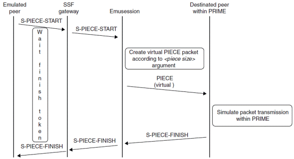 Because a PIECE message includes the data itself, in a typical emulation this information flows from a virtual machine (VM) to an SSF gateway. Then, it is forwarded to the corresponding EmuSession (Liu, 2008) within a PRIME instance. Finally, a Reader Thread (Liu, 2008) creates a virtual packet that is injected into the simulation environment. This complete process is shown in Figure 2. Notice that emulation of a large number of emulated peers requires some type of virtualization (Barham et al., 2003). Therefore, there is one drawback to sending entire pieces: during an experiment, several VMs that are running one python BitTorrent instance might share a physical host. Since the network interface is also shared among emulated peers, this might lead to bandwidth constraints and bottlenecks.