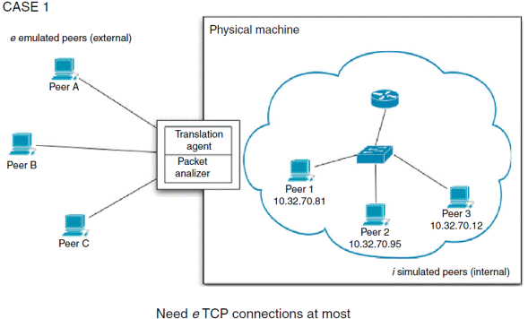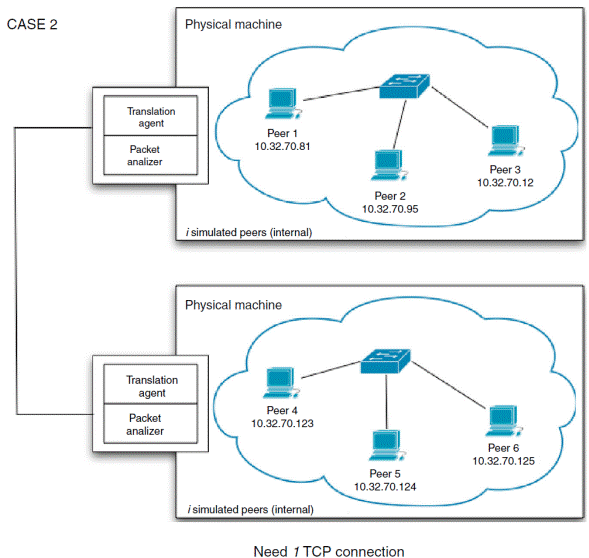 Emulated peers communicate with simulated hosts using a kind of proxy that we call Translator Agent (TA), which acts as a mediator between emulated peers and simulated instances to translate messages and make communication feasible. A TA is needed in the following two cases.