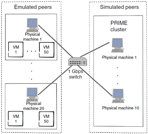 After this assessment process, our final test bed was able to run 3000 peers: 1000 were emulated while 2000 remained simulated. This configuration is shown in Figure 6. Emulated peers ran using 50 OpenVZ containers per physical host, while simulated peers ran in PRIME using a cluster of 10 computers with a kernel patch to enable time dilation (Grau et al., 2008).