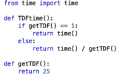 Also, a time dilation factor (TDF) (Grau et al., 2008) of 25 was used to guarantee the required bandwidth for the experiments. Since OpenVZ does not support time dilation we used a simple yet effective approach to implement it in the BitTorrent source code. These additions can be seen in Figure 7. A TimeDilation.py file was created and imported in all modules which required the time() function, then, calls were substituted with the TDFTime() implementation.