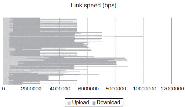 To create a network model that replicates a real scenario, the data obtained in (Dischinger, Haeberlen, Gummadi, & Saroiu, 2007) was used which, to our knowledge, was the first large-scale measurement study of major cable and DSL providers in North America and Europe. Two types of broadband access networks were considered: digital subscriber line (DSL) and cable. Both link types typically have asymmetric bandwidth, that is, their downstream bandwidth is higher than their upstream bandwidth. These heterogeneous download and upload bandwidths are depicted in Figure 8, x-axis represent the link speed, while y-axis denote hosts.