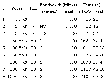 To evaluate the behavior of the time dilation implementation for the BitTorrent application, several experiments were run sharing a 140 MB file in a simulated 100 Mbps switched environment. This information is summarized in Table 1.