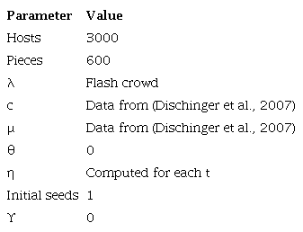 To evaluate if our platform was consistent with the behavior of an authentic BitTorrent swarm, we compared the simulation results with a fluid model developed in (Qiu & Srikant, 2004). The notation for this mathematical model is the following: