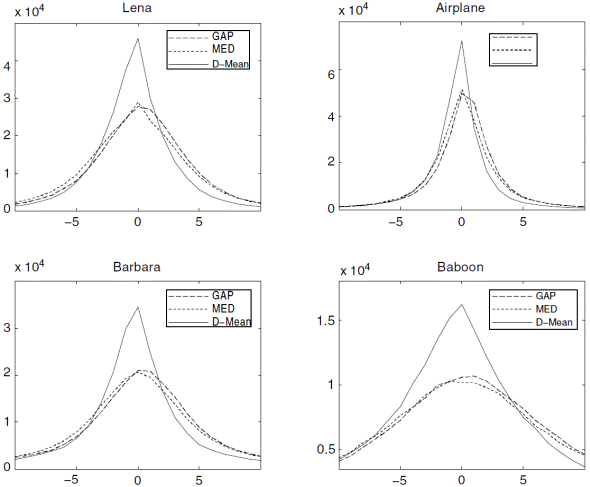 For each pixel, the predictor first checks if neighboring pixels (xn , xs ) or (xe, xw ) are close enough to be on the same edge, an edge sensitivity threshold TS is used for this purpose. For vertical edges, if both xn and xs are less than MinH (a dark edge on a bright background) or both are greater than MaxH (bright edge on a dark background) then there exist an edge which passes through xn and xs (a vertical edge). Horizontal edges are detected in the same manner and current pixel prediction is calculated. If there exist no definite edge, mean of 2nd and 3rd largest pixels from {xe, xw, xn, xs } is taken as prediction. Using this method the predicted value may not be an integer, which must be converted to an integer if it is to be used in RW, for that purpose floor of the predicted value is calculated. The PE histogram of MED, GAP and D-Mean predictors is compared in Fig. 2. Significant improvement is observed for all four standard images, i.e. Lena, Airplane, Barbara and Baboon. Surge in the histogram peaks at 0 and short tail of PE for D-Mean confirms the superior performance of the proposed D-Mean predictor over MED and GAP methods.