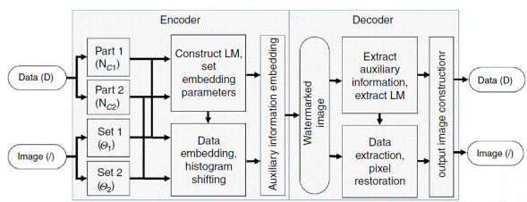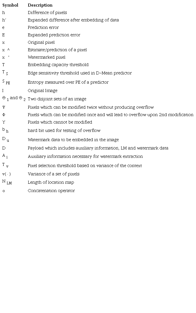 Kim, Sachnev, Shi, Nam, and Choo (2008) further used a simplified approach to reduce the size of LM and need for lossless compression was evaded. van der Veen, Bruekers, van Leest, and Cavin (2003) used companding technique for reversible water-marking of audio streams while van Leest, van der Veen, and Bruekers (2004) extended the same method for images. For data hiding Ni, Shi, Ansari, and Su (2006) used shifting of bins in histogram of image pixels. Yang, Schmucker, Funk, Busch, and Sun (2004) presented a generalized RW method for coefficients of integer discrete cosine transform. In another research Yang, Schmucker, Busch, Niu, and Sun (2005), they also used high frequency wavelet coefficients with histogram expansion. Luo et al. (2010) introduced an interpolation based RW method which has high fidelity but with relatively low capacity. Hong, Chen, Chang, and Shiu (2010) presented a high performance error expansion based RW method. Tsai, Hu, and Yeh (2009) compute the residual image from basic pixels and reference pixels in nonoverlapping blocks, high payload is achieved by multilevel embedding in residual image. Luo et al. (2010) used full context for interpolation of a pixel, interpolation error is expanded to embed data. Due to the fact that they have used 8 neighbors of a pixel context their results are significantly improved from methods that uses MED and GAP based prediction mechanism which use 3 and 7 pixels respectively.