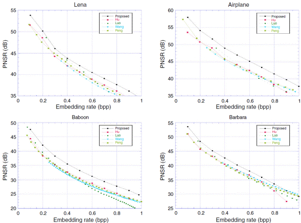 The method is assessed by comparing with Hu et al. (2009), Luo et al. (2010), Wang, Li, Yang, and Guo (2010) and one of the recent works by Peng et al. (2012). Results are compiled over the standard grayscale images of Lena, Airplane, Barbara and Baboon of size 512 × 512. The images are shown in the Fig. 5. The imperceptibility results are given in Fig. 6. The superior performance of the proposed method can be observed over all the test images. Improvement in results is primarily due to the use of high performance D-Mean predictor in the prediction mechanism. Maximum payload that can be embedded in a single pass of the proposed method is at most 1 bpp. Hence, for large payload size, the method should be applied iteratively.