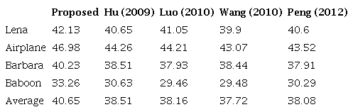 Selection of appropriate value for Edge sensitivity threshold TS , is important for predictor performance. In this work the TS is empirically determined and a value of 5 is used. It may be observed that the EC threshold controls the dual behavior of the predictor. For smaller values of TS the predictor will act like median of four pixels, while large value of the threshold will make the predictor similar to mean predictor. An image, I after watermark embedding phase is noted as, I’. Imperceptibility test of the methods is carried out based on PSNR for a specific bpp (bits per pixel). Higher PSNR is always desired. It can be computed using Eq. (19). Comparison based on PSNR measure of watermarking methods is provided in Fig. 6. Imperceptibility test for a specific bpp of 0.5 is provided in Table 4. An average of 2.14 (dB) improvement in PSNR can be observed in comparison to Peng et al. (2012):