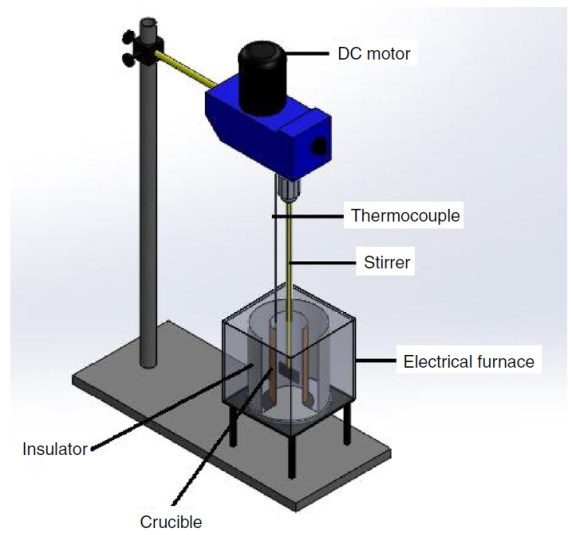 A356 Al-Si alloy was used as the matrix and 10, 20 and 25 wt% SiC particles in the range size of 32-80μm were employed as the reinforcement in fabrication of the composites. Chemical composition of A356 alloy is presented in Table 1. An electrical resistance furnace with a stirring mechanism (Fig. 1) was used for the dispersion of the ceramic particles into liquid aluminum. The SiCp were heated to a temperature of 900◦C within 2 h in a muffle furnace to increase their surface reactivity. The heat-treated particles were then added into the aluminum melt in semi-solid state (605 ± 5◦C) through the vortex, whereas slurry was stirring with speed of 600 rpm for 20 min. Then the composite melt was reheated to 670◦C and stirred again for 10 min to prevent the particles from settling. Finally the melt was poured into a cylindrical permanent mold at 630 ± 5◦C.