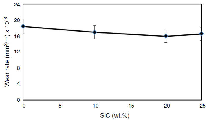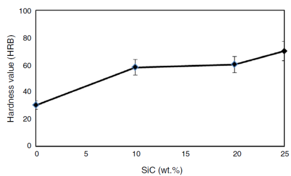 The hardness value increases as the percentage SiCp addition increases in the alloy (Fig. 6). This is due to increase in the percentage of the hard and brittle phase of the ceramics in the alloy. The silicon carbide addition reinforced the alloy by increasing the dislocation density at the particles-matrix interfaces. Amirkhanlou and Niroumand (2012) proposed that the differences in the coefficient of thermal expansion (CTE) between the hard and brittle reinforcing particles and the soft and ductile metal matrix result in the elastic and plastic incompatibility between the matrix and the reinforcement. Thus improves the mechanical properties. Furthermore, Panwar and Pandey (2013) reported that the hardness values of composite materials are affected by distribution of ceramic particles inside the matrix alloy and the surface bonding in interface of matrix and reinforcement. The homogeneous distribution of ceramic particles in the matrix and presence of good interfacial bonding in interface give rise to hardness value of MMCs.