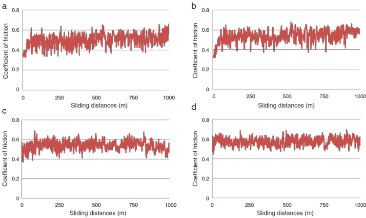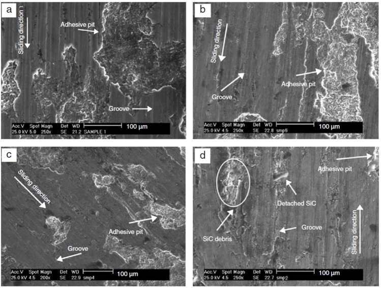 Figure 11 shows the friction coefficient values of the matrix alloy and MMCs containing different percentages of SiCp. The friction coefficient values of the matrix alloy and composite materials were in expected range for light metals in dry sliding conditions. As shown in Figure 11, the friction coefficient of MMCs are higher than those for the A356 alloy which corresponds to lower value of the wear rate compared with the matrix alloy (Fig. 10). It has been mentioned that the hard SiCp penetrate deep into the counter surface leading to formation of microchips from counter surface. As a result, greater amount of frictional force is required for sliding of composite over the counter surface, Ghandvar, Farahany, and Idris (2017). Therefore, as the SiCp content increases, the number of SiCp penetrating to the counter surface increases and thus the coefficient of friction in composites increases with increase in SiCp content. Furthermore, during the sliding, the pins of matrix alloy deform plastically during sliding, which result in low friction coefficient. The higher coefficients of friction in the case of composites containing hard SiCp are due to the formation of tribofilm at the interface between pin and disk. If the effective load on the individual particle is above its flexural strength, the particles get fractured. Parts of the removed SiCp are entrapped between two partners, i.e. asperities of softer material of pin and asperities of harder material (hardened steel disk), possibly leading to three-body abrasion; the result will then be more surface roughness between contacting surfaces and increase of coefficient of friction, which has been reported by Vencl et al. (2010). The increase of the friction coefficient with the amount of reinforcement particles is ascribed to the fact that the amount of protruded particles increases during wear occupying larger area of pin surface. At the same time, one part of protruded particles are torn away from the matrix and fractured into fragmented pieces. In this situation, the contact between the hard particles and the counter body material is resulting in higher coefficient of friction. However, in A356/25wt%SiC, in addition to the protruded SiC particles, poor interfacial bonding between the matrix and SiCp as well as particle clustering, which leads to particle transferring from the matrix to the pin and disk interface during sliding, leads to coefficient of friction to be increased.