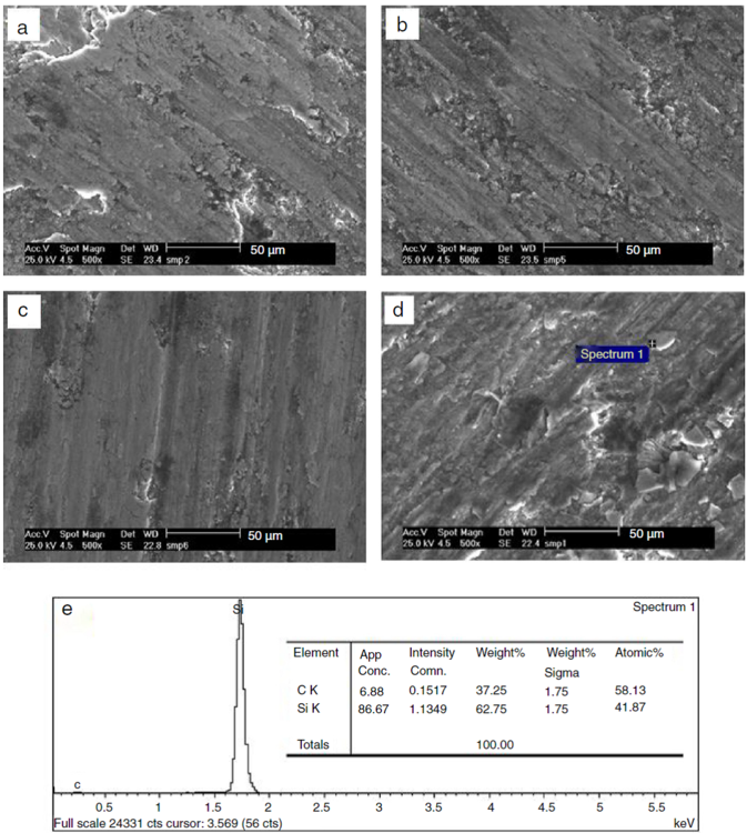 Figure 12 shows the worn surfaces of A356 alloy and different fabricated composites which were examined under SEM. Figure 12(a) shows the worn surface of A356 alloy. The A356 matrix alloy is much softer than the counter body material, and during sliding the counter body penetrates into the matrix alloy, producing deep grooves and causing extensive plastic deformation and abrasion of the surface, which results in great material loss and significant wear rate (Fig. 10). The worn surfaces also contain the evidence of adhesive wear in the form of adhesive pits due to the delamination of surface. On the other hand, the large scale of the matrix alloy is transferred to the counter body. The flow of materials along the sliding direction, the generation of cavities due to the delamination of surface materials and tearing of surface material are also noted in this figure. Another reason for significant material removal of A356 alloy is debris of coarse eutectic silicon particles which are cracked during the wear test and adversely affect the soft matrix leading to substantial wear. Figure 12(b, c) shows the worn surfaces of A356/SiCp composites with 10 and 20 wt% SiCp, respectively. Formation of continuous wear grooves with decreasing in depth and width of the grooves and pits on the worn surfaces and formation of parallel lips along the continuous groove marking can be observed on the worn surfaces compared to worn surface of A356 alloy. In fact, enhanced amount of SiCp prevents severe wear by protecting the soft matrix and improving wear resistance. In addition, since the particles remain well bonded with the matrix during sliding in A356/SiCp composites with 10 and 20 wt% SiCp, the aluminum matrix that surrounds the particulates will be worn away, and essentially all contact will be between the reinforcing particles and the counter body. Furthermore, increasing the SiCp content leads to modification of eutectic silicon in the fabricated composites, the tendency of the eutectic silicon to fracture during sliding and consequently crack formation is decreased. However, in spite of high hardness and more refined eutectic silicon in A356/25wt%SiCp compared to other fabricated composited sporadic deep caverns formed by the pull-out of SiCp from the matrix indicate particle clustering and relatively weak interfacial bonding between the aluminum matrix and SiCp (Fig. 12 (d)). These SiCp, fractured into fragmented pieces are entrapped between the pin and the counter body, and together with the protruded SiCp from the matrix act as abrasives, enhance material removal from the contact surfaces and decrease the wear resistance. Furthermore, the wear track widths of A356 alloy and fabricated composites is reduced in the worn surfaces with increased content of SiCp, i.e.; from 26 m in A356 alloy to 19 and 15 m in MMCs reinforced with 10 and 20 wt% SiCp, respectively, indicating lower material removal in comparison with A356 matrix alloy as evidenced in SEM photograph shown in Figure 13(a-c). However, in MMCs with 25 wt% SiCp (Fig. 13d), the wear widths of the worn surface increase to 22 m, which is due to abrasive action of fragmented or protruded SiCp. The EDS result (Fig. 13e) confirms the presence of SiCp on the worn surface of MMCs with 25 wt% SiCp. In fact, defects such as clusters of reinforcement particles impair the mechanical and tribological properties of the composite. Differences in particle sizes, densities, geometries, flow or development of an electrical charge all contribute to particle agglomeration. The uniformity in distribution of particles within the sample is a microstructural feature which determines the in-service properties of particulate AMCs.