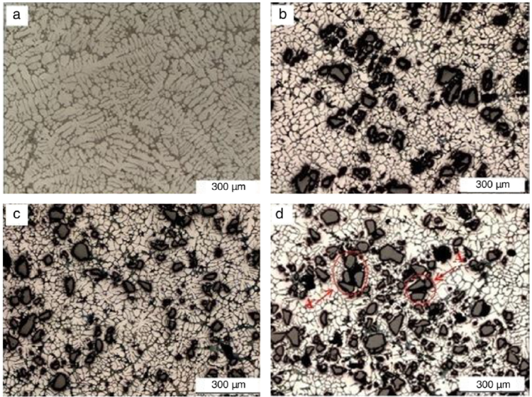 Figure 4(a)-(d) shows high magnification SEM images of eutectic Si in the A356 alloy and in the vicinity of SiCp in MMCs reinforced with 10, 20% and 25 wt% SiCp, respectively. According to Figure 4(a), acicular silicon can be seen in interdendritic regions of A356 alloy. However, there is a significant refinement in the size of eutectic silicon particles with an increase in SiCp weight fraction to 10 and 20 wt% SiCp as shown in Figure 4(b) and (c), respectively, and the largest refining effect of eutectic silicon (due to more incorporation of SiCp) is achieved when 25 wt% SiCp is added into the melt (Fig. 4d). Nagarajan, Dutta, and Surrapa (1999), Lashgari, Zangeneh, Shahmir, Saghafi, and Emamy (2010) reported that due to the particle pushing phenomena, SiCp were rejected by the solidification front and finally trapped in the interdendritic zones. As a result, SiCp act as a physical barrier for eutectic silicon growth during solidification and leads to refinement of eutectic Si.