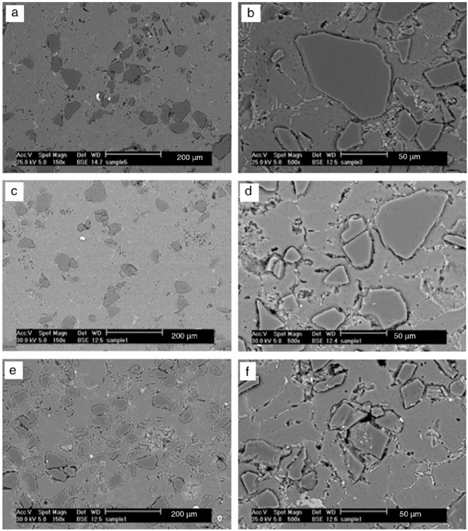 Optical micrographs of A356 alloy and MMCs reinforced with 10, 20 and 25 wt% SiCp are shown in Figure 2(a)-(d), respectively. Microstructural studies revealed a reasonably uniform distribution of SiCp with 10 wt% (Fig. 2(b)) and 20 wt% (Fig. 2(c)) SiCp without any particle macro-clusters. Ghandvar, Farahany, and Idris (2015), Hashim, Looney, and Hashmi (2001) have shown that distribution of SiCp influenced by good wett-ability of the silicon carbide by the molten metal and good interfacial bonding between SiCp and matrix material. However, some areas show agglomerates of SiCp in the alloy reinforced with 25 wt% SiCp as shown in Figure 2(d) (Mark A). Moreover, SiCp significantly refined the grains of Al matrix, as shown in Figure 2. The average grain size was about 100 μm in the alloy. It was about 50 μm in the 10 wt% composite. The grains were, respectively, reduced to 25 and 20 μm in 20 wt% and 25 wt% composites. OM observation also confirmed that most particles were segregated along grain boundaries in the micro-scale level. The grain refinement was mainly caused by particles’ obstacle to grain growth. Surappa (1997) reported that during their solidification, particles were mainly pushed to the intergranular regions, so particles limited the movement of Al grain boundaries and then retarded the grain growth. As an another indication of distribution of SiCp, cross sectional SEM microstructures of MMCs reinforced with 10, 20 and 25 wt% SiCp are presented in Figure 3(a-f) in low and high magnification. As shown, there is a uniform distribution of SiCp in MMCs with 10 (a, b) and 20wt%SiCp (c, d) and some agglomeration areas of SiCp with 25 wt% of reinforcement particles (e, f).