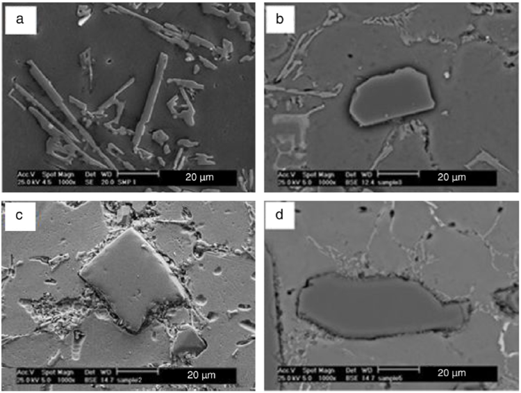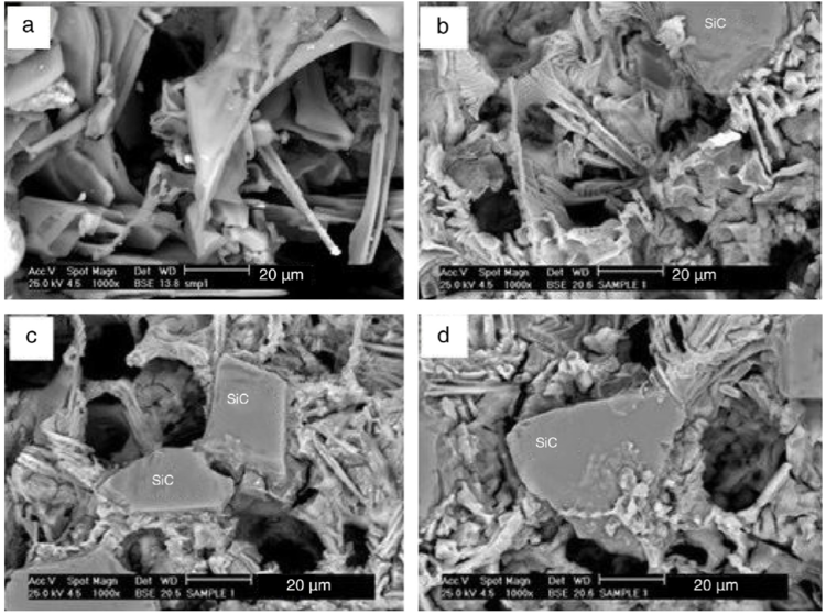 In addition to the refinement of silicon, SiCp also affect the morphology of eutectic silicon and the aspect ratio of the eutectic silicon decreases with increasing SiCp content in the MMCs. It is difficult to distinguish the changes in the morphology of eutectic silicon due to the effect of SiCp in Figure 4. Thus, samples with different SiCp contents were deeply etched to remove the Al matrix, and three-dimensional structures of the eutectic silicon phase were analyzed with SEM. The microstructures of the eutectic phase of A356 alloy and MMCs are shown in Figure 5 (a-d). The figures display the structural differences between A356/SiCp MMC with different SiCp contents. In A356 alloy, the eutectic silicon structure consists of large silicon plates, as shown in Figure 5a. In the MMC containing 10 wt% SiCp, the eutectic silicon structure was observed in the form of short silicon plates (Fig. 5b), whereas the needle shape eutectic silicon are found to have formed around the SiCp in the MMC containing 20 wt% SiCp (Fig. 5c). In addition, morphology of eutectic silicon also changes from needle shape to equiaxed in the presence of 25 wt% SiCp (Fig. 5d). The result clearly indicates that the eutectic silicon has undergone a transition from a plate-like to equiaxed morphology with increasing weight fraction of SiCp in the matrix. Another reason for modifications in the size and shape of eutectic silicon is presence of some eutectic silicon on the surface of SiCp in Figure 5d, which indicates heterogeneous nucleation of eutectic silicon on SiCp. In addition, presence of SiCp can also affect the thermal field (because of thermal mismatch between the matrix and SiCp) and solute field(by interrupting diffusion of solute silicon) locally and thereby cause refinement of silicon, (Nagarajan et al., 1999). As expected an increase in the weight fraction of SiCp promotes further nucleation of silicon on SiCp and causes an increased refinement of silicon (Fig. 5d). Silicon morphology is modified also by introducing of zircon sand particles to Al alloy. Kaur and Pandey (2010) have reported that zircon sand particles provide nucleation site for solidification of Si and changes the morphology of silicon particles from long thin needle shape to globular. In fact, the localized cooling effect produced by zircon sand particle around its vicinity led to such type of morphological changes. The particles get embedded in the molten alloy and extract heat at higher rates from the surrounding melt, which give rise to localized rapid cooling effect during solidification. Because of this phenomenon, the formation of small globular Si morphology in vicinity of zircon sand particle was observed. Similarly, Kaur, Anant, and Pandey (2011), found structural variation on transition of silicon phase morphology to spherical shape in near eutectic Al-Si alloy with addition of Sn. When the SiCp is introduced into the melt, due to difference in the temperature of SiCp and molten metal, a thermal gradient has been generated which give rise to the splat quenching in the region around its deposition leading to generation of small silicon globules around the SiCp.