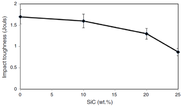 The results of the impact toughness of the fabricated MMCs as a function of weight percentage of SiCp are shown in Figure 7. It can be seen that although increasing the SiCp content in the matrix alloy leads to the refinement and modification of the eutectic silicon, the impact toughness decreased as the content of SiCp addition increased. The brittle nature of the reinforcing materials (SiCp) plays a significant role in degrading the impact toughness of the composites. Therefore, the lower impact toughness of A356/25%SiCp MMCs (0.87 J) compared to other alloys can be attributed to the presence of more brittle SiCp in the matrix, which may act as stress concentration areas. Furthermore, the heterogeneous dispersion of SiCp in A356/25wt%SiCp composite resulted in the formation of clusters. The clustered particles were easily separated under the impact loading. When this failure combines with the failures of debonding in the particle-matrix interface, the impact toughness of composites decreases drastically. Since A356 alloy and MMC with 10% SiCp have the highest impact energy (1.7 J, 1.6 J), respectively, compared to other fabricated composites, it is manifest that they are the toughest of them all.