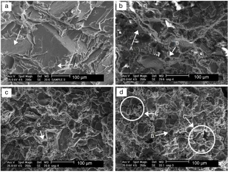 The fractured surface of the impact testing samples with its longitudinally sectioned profile was investigated to examine the type of failure under SEM which are presented in Figures 8 and 9, respectively. Elsebaie, Samuel, and Samuel (2011) observed that the fracture mechanism of the Al-Si systems consists of two main stages, initiation of microcracks and propagation of crack to fracture. The coarse flake or needle-like Si are sites for high stress concentration and initiation of microcracks as shown in Figures 8a and 9a. Figure 8a shows the cleavage fracture surface of the A356 alloy. The microcrack initiated due to fracture of the coarse Si phase as shown in Figure 9a. The crack propagated to the adjacent microcracks of the fractured Si particles forming a principal crack, Elsebaie et al. (2011). The crack then propagates through the cleavage of coarse Si as shown in Figure 8a (point A) indicating mainly brittle intergranular fracture mode (Fig. 9a). Figure 8b shows the fractured surface of the 10 wt% SiCp composite reinforced A356 alloy. Cleavage fracture of the fractured coarse eutectic silicon (Mark A) was observed along with dimple structure (point B) indicating ductile fracture. In fact, existence of dimples is due to refinement of some eutectic silicon with increasing the SiCp content to 10%. Therefore, main crack crosses a two-phase zone in eutectic Al-Si. As a result, A356/10wt%SiCp composite failed in transgranular-intergranular mode (Fig. 9b), Casari, Fortini, and Merlin (2013). Increasing of SiCp content changes the fracture behavior of composite samples significantly. Figure 8c shows the fractured surface of 20 wt% SiCp composite sample. The distribution of SiCp appears to be reasonably homogeneous without clustering or agglomeration. Dimples can be seen on the fractured surface (mark B) as a result of refinement of eutectic silicon. There is no void formation or debonding between matrix and particle reinforcements interface, which indicates a good matrix-reinforcement interfacial bonding. Although there is no debonding, the particle cracking is clearly seen (Fig. 9c). Therefore, the failure mode is dominated by the particle cracking where fracture of particles takes place when the interface is stronger than the particles. However, with increasing weight percentage of SiCp to 25%, it is more difficult to obtain a homogeneous particle distribution which result in the formation of clusters, which make it prone to crack formation and propagation (Fig. 8d) - (mark C). Furthermore, it can be seen that the void around the particles is related to the inter-facial debonding and the failure phenomena indicates weak particle-matrix interface. It has been observed in Figure 9d, that both clusters of particles and weak particle-matrix bonding have caused preferential directions for crack growth mechanism. An explanation for this failure mechanism is that in regions of clustering or agglomeration and decohesion of interface, the short interparticle distance facilitates linkage between neighboring voids and microscopic cracks as a direct result of decreased propagation distances between SiCp. These failure mechanisms had a significant effect on decreasing the impact toughness of composites (Fig. 7).