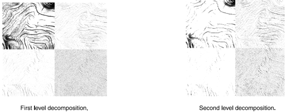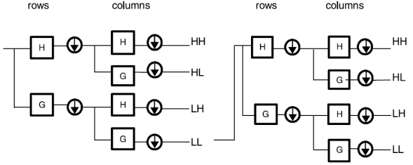 The 2D-DWT is a multi-resolution analysis and decomposes images into wavelet coefficients and scaling functions. Dyadic wavelet decomposition is achieved using 2 channel filter banks composed of a low-pass (G) and high-pass (H) filter and each filter bank is then sampled at a half rate of the previous frequency. DWT transforms the original image into four subimages namely low-low (LL), low-high (LH), high-low (HL) and high-high (HH) through low pass filters and high pass filters. An example of DWT with two levels of decomposition is shown in Figure 1. Every subimage contains information of a specific scale and orientation. The original image is thus represented by a set of subimages at several scales for which they are called the multi-scale representation. Because the images are dilated by a factor of two, this is also known as dyadic wavelet transform. The features obtained from these DWT transformed images are useful for texture analysis. A number of basis functions are used as the mother wavelet for wavelet transformation. The mother wavelet determines the characteristics of the resulting wavelet transformation. Some of the wavelet functions that are used for wavelet transformation are Haar, Daubechies, Symlet, Coiflets, Bior, Meyer, Morlet, etc. The oldest and the simplest wavelet is the Haar wavelet. The Daubechies wavelets are the most popular wavelets. The Haar, Daubechies, Symlet and Coiflets are compactly supported orthogonal wavelets. The wavelets are selected on the basis of their shape and ability to analyze the signal in particular application.