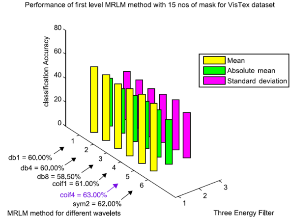 The third experiment evaluates the effectiveness of the proposed MRLM method. DWT with different wavelet basis functions (db1, db4, db8, coif1, coif4, sym2) are applied on two sets of texture databases. Then, Laws’ masks descriptors are applied on the decomposed images obtained at different levels with different wavelet functions. The output results are then passed through three different types of energy measurement filters. After normalization, statistical features like absolute mean, mean square and entropy are extracted from different energy measurement filters.