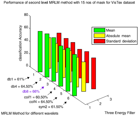The results obtained for VisTex database for the first level of decomposition are also given in the same Table 3. It can be seen that the proposed method gives the best accuracy of 63% with coif4 as basis. The second and third best accuracy of 62% and 61% are achieved from sym2 and coif1 as wavelets basis respectively. The wavelets db1 and db4 provide an accuracy of 60%. The lowest accuracy of 58.50% is obtained with db8 as basis, but still it is higher than the existing descriptors. From Table 4 it is observed that the highest classification accuracy of 66% is obtained at the second level of decomposition with db8 as basis, which is 9% more than the existing Laws’ masks descriptor. In addition, we have achieved better accuracy for other wavelet basis functions such as, 64.50% for db4 and coif4, 61.50% for sym2, 61% for db1 and 60.50% for coif1 as listed in Table 4. At the third level of decomposition, the classification accuracy starts decreasing for some wavelet basis functions as reported in Table 5. The best classification accuracy of 62.50% is obtained with sym2 as basis at the third level of decomposition. Accuracy of 61% for db4, 58% for db1 and 57.50% for coif1 and the lowest accuracy of 56% for db8 and 51% for coif4 are obtained at the third level of decomposition. The above mentioned results are achieved only for the mean energy filter. There is no improvement in classification accuracy for the absolute mean and standard deviation energy filters. Figures 11-13 show the performance results of VisTex database for the proposed MRLM method with 15 numbers of masks.