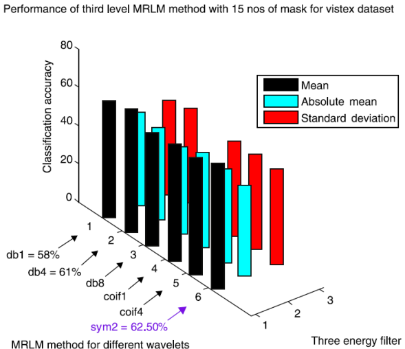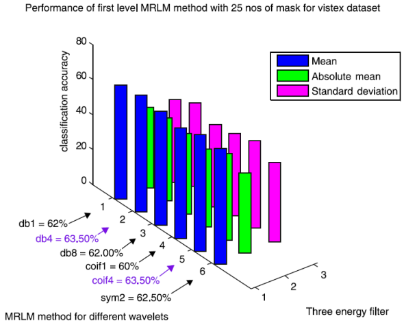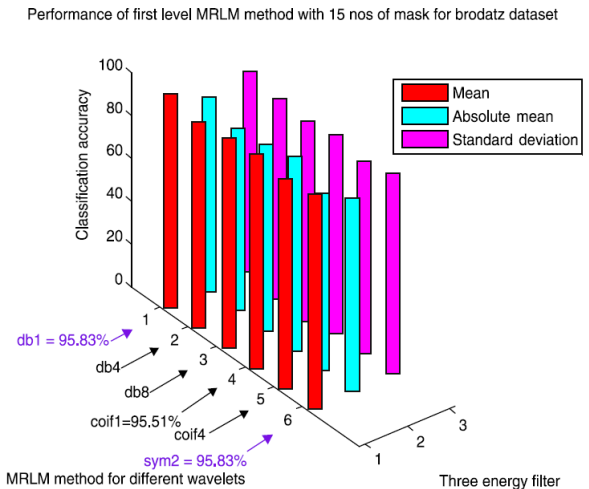 From Table 3, we can observe that for the Brodatz database, MRLM method for mean filter with db1 and sym2 as basis have been able to achieve highest classification accuracy of 95.83% at the first level of decomposition. The second best classification accuracy of 95.51% is obtained from the same mean filter having coif1 as wavelet basis. Also for db8 classification accuracy of 93.91% is obtained which is higher than the traditional Laws’ mask descriptor. For coif4 accuracy of 93.27% is achieved which is same as traditional Laws’ mask method. Furthermore, for absolute mean and standard deviation filter it has detected that classification accuracies of 86.54% and 90.06% for db1 wavelet, which shows better accuracy than traditional Laws’ masks method. The lowest classification accuracy of 92.31% is obtained for the mean filter with db4 as basis. The classification results for the higher levels of decomposition are listed in Tables 4 and 5 respectively, which show that the classification accuracies are reduced for the mean and absolute mean filters. However, it is noticed that the standard deviation filter has yielded an accuracy of 90.71% at second and third level of decomposition with coif1as basis. Figure 9 shows the performance results of Brodatz database for the proposed MRLM method with 15 numbers of masks.