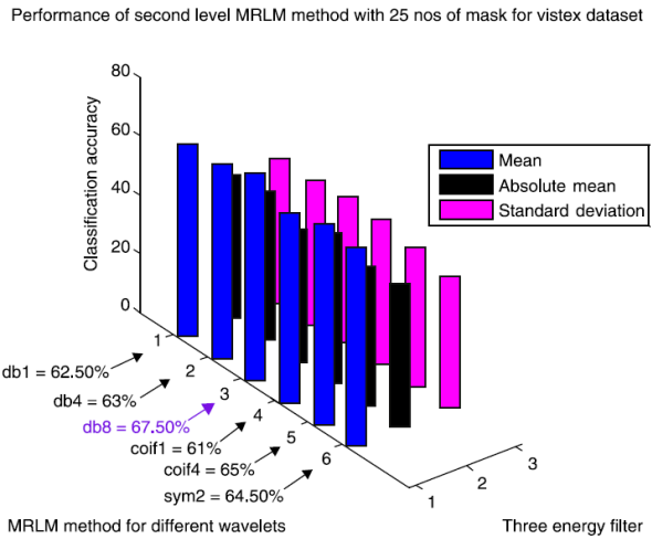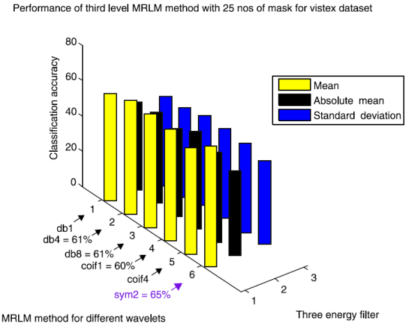 Table 6 exhibits the classification success rates of Brodatz database for the proposed method MRLM with 25 numbers of masks at the first level of decomposition. The results show that the highest classification accuracy 96.79% is achieved with db1 as basis for the mean filter. For absolute mean and standard deviation filters, classification accuracies of 89.74% and 92.95% are obtained respectively for the same wavelet basis. The second highest accuracy 96.15% is obtained from coif1, coif4 and sym2 as basis for the mean filter. The classification accuracy is reduced to 94.23% for db4 and 90.38% for db8 respectively for the mean filter. There is no further improvement of classification accuracy for the absolute mean and standard deviation filters, by using rest of all the wavelets for the first level of decomposition. Tables 7 and 8 display that at the higher levels of decomposition classification accuracies are reduced for the all the three energy measurement filters on Brodatz database. Figure 10 shows the performance results of Brodatz database for the proposed MRLM method with 25 numbers of masks.