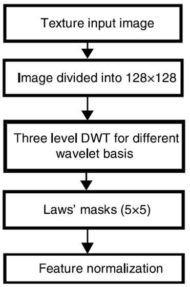 The prime objective of this investigation is to assess the performance of the proposed MRLM technique for extraction of texture features by integrating DWT and Laws’ mask, the two existing texture descriptors. The texture features are classified by k-NN classifier. MRLM method is introduced for further enhancement of classification accuracy than the traditional dyadic wavelet transform and Laws’ masks methods. The procedural steps of the proposed method are given in Figure 2.