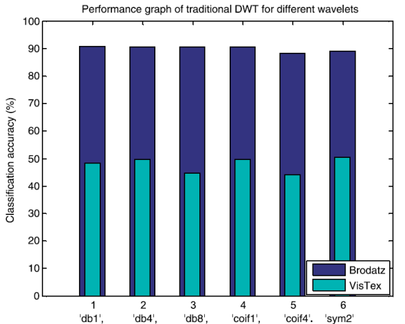 The first experiment deals with the performance evaluation of the traditional DWT method. DWT with different wavelet basis functions (db1, db4, db8, coif1, coif4, sym2) are applied on two sets of texture databases. Then, statistical features such as mean and standard deviation are extracted from the decomposed images for different levels.
