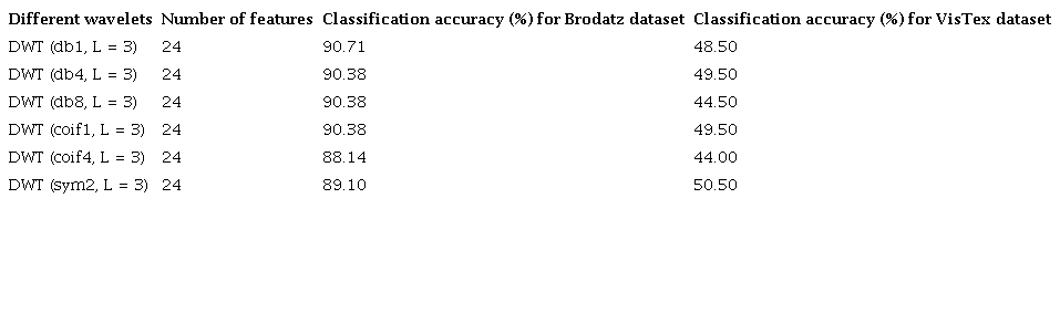 As we have examined our proposed method with Brodatz and VisTex database, a brief review on recently developed methods that classify these two databases are discussed. Qiao et al. have proposed a new method for extraction of texture features with a combination of the phase difference and the magnitude variation information of the complex wavelet coefficients, and then modelled the measure with the real generalized Gaussian distribution (GGD). They have verified the proposed method with two different datasets created from Brodatz database with different sizes of images and the third dataset is created from VisTex database with k-NN as classifier. The best classification accuracies achieved are 92.1% on the first dataset of Brodatz and 83.1% on the second dataset of Brodatz. Classification accuracy of 84.6% is obtained on VisTex database (Qiao, Zhao, & Song, 2009). Dong and Ma have suggested a new method for feature extraction through contourlet subband clustering for texture classification. They have evaluated the proposed method with two different datasets created from Brodatz database and two different datasets created from VisTex database, and obtained different classification results from each created databases using k-NN as classifier. They have achieved classification accuracy of 99.92% on the first dataset and 96.81 ± 0.44% on the second dataset of Brodatz database. The best classification accuracy of 99.25 ± 0.38% is obtained on the first dataset and 85.95 ± 1.50% on the second dataset of VisTex database (Dong & Ma, 2013). Susan and Hanmandlu have proposed a new method of probabilistic non-extensive entropy feature for texture characterization and achieved highest classification accuracy of 97.78% on Brodatz database using SVM as classifier (Susan & Hanmandlu, 2013). Yuan has recommended a rotation and scale invariant local binary pattern by collectively considering high order directional derivatives, circular shift sub-uniform, and scale space. The proposed method delivered highest classification accuracy of 75.2% on Brodatz database (Yuan, 2014). Murala and Wu have proposed a combination of Gabor transform with robust local binary (RLBP) operator and the maximum classification accuracy is found to be 84.92% on Brodatz database and 93.25% on VisTex database (Murala & Wu, 2014). Zhang et al. have recommended a technique by combining spiking neural network and Fast wavelet transform (SNN-FWT), and obtained best classification rate of 98.93% on Brodatz database with k-NN as classifier (Zhang, Wu, Zhuo, Wang, & Huang, 2015). Florindo et al. have recommended combinations of traditional texture descriptors with non-additive entropy. They have achieved best classification accuracy of 92.51% on Brodatz database and 93.52% on VisTex database with a combination of grey level co-occurrence matrix (GLCM) with non-additive entropy using Linear Discriminant Analysis (LDA) as classifier (Florindo, Assirati, & Bruno 2015). Tang et al. have suggested a new texture extraction method combining non-overlap window local binary pattern and grey level co-occurrence for green tea leaves classification, where they have also verified the proposed method on Brodatz database. They have achieved maximum classification accuracy of 94.8% on Brodatz database with back propagation neural network as classifier (Tang et al., 2015).