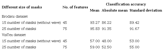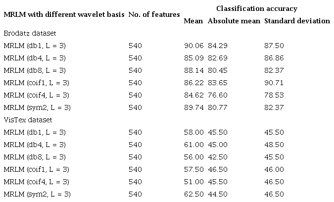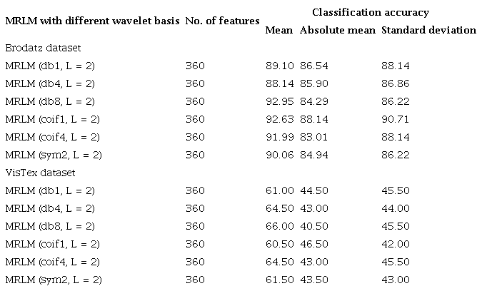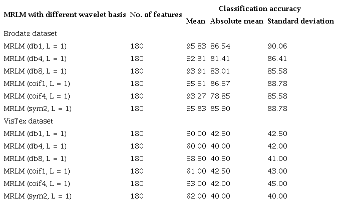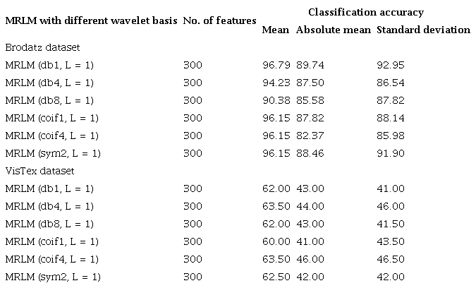 The experimental results show that the proposed MRLM method (for both 15 numbers and 25 numbers of masks) provides highest classification accuracy at the first level of decomposition on Brodatz database. On the other hand, for VisTex database rise in classification accuracies are observed up to the second level of decomposition. Afterwards, the classification accuracies are reduced for some wavelets at the third level of decomposition. It has been observed that for both the databases there is a reduction in classification accuracy at the higher levels of image decomposition. The reason is that DWT create low-resolution images that do not preserve qualitative visual information.
