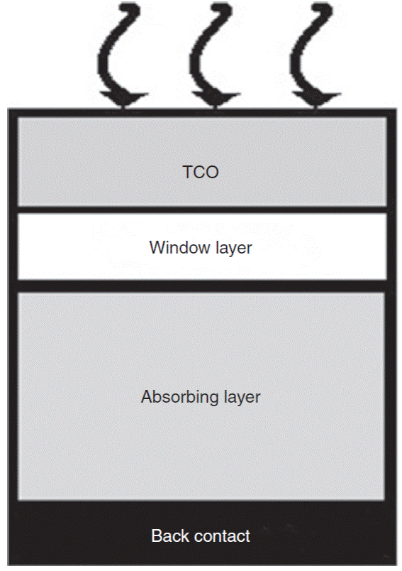 The reference structure of a thin film solar cell is shown in Figure 1. It is formed by three main regions: The transparent conducting oxide (TCO) which allows the light passing to the hetero-junction, the window semiconductor layer (typically CdS), and the absorbing semiconductor material. Ohmic contacts are both made at the back of the absorbing layer and at the front TCO layer in order to connect the cell to the external circuit. We shall assume that the back is covered by a metallic contact which reflects totally those photons that pass the absorbing layer without being absorbed causing a second pass of such photons through this layer.