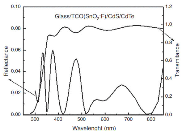 The calculated reflectance R(λ) and transmittance T(λ) of the structure depicted in Figure 10 is shown in Figure 12 in the range of 300-850 nm. The range of wavelength is shorter than for the CIS cell since the absorption edge of CdTe is smaller than for CIS films. It is worth mentioning that the average reflectance in this structure is smaller than for the above CIS structure (less than 6%).