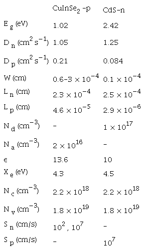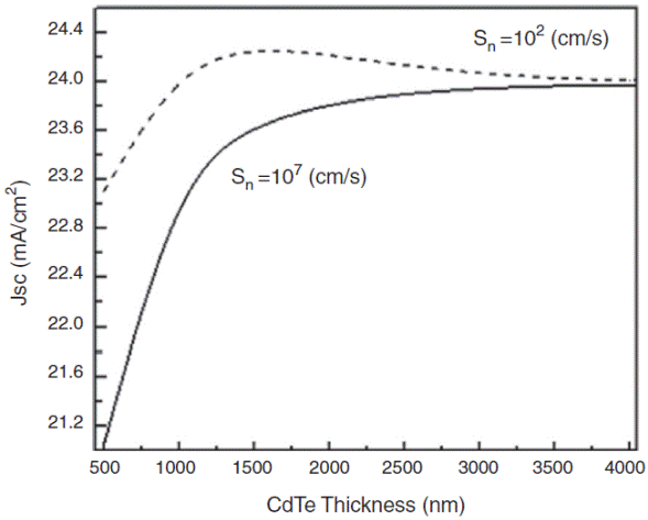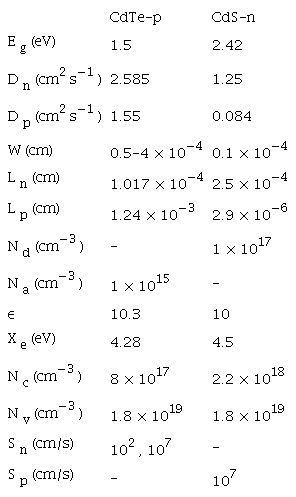 Table 2 contains the physical parameters for CdS and CdTe used in the calculation of the solar cell mentioned above. The calculation was also made for two values of back recombination velocity Sn . The low recombination velocity value can be achieved by having a specially treated CdTe layer. For example, an etching at the back may cause a tellurium rich surface, achieving a p+ region. In addition, Morales-Acevedo (2014) has suggested the inclusion of an additional back p+ layer of another material, such as ZnTe, forming a back heterojunction that blocks electrons flowing to the back contact. This minority carrier blocking should reduce strongly the recombination velocity at the back.