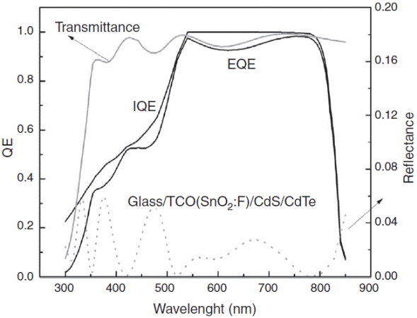 Figure 14 shows the external and internal quantum efficiency for the CdS/CdTe solar cell with a CdTe thickness of 1 m and back recombination velocity of 102 cm/s, which corresponds to the cell with the best performance as will be seen in Figure 16.