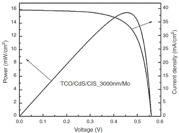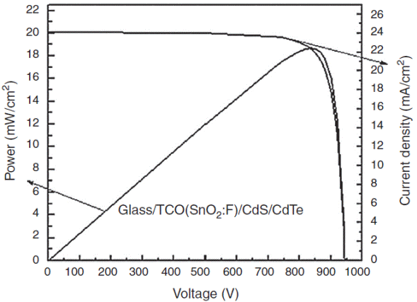 In Figure 15, the expected J-V and P-V curves (current density and power as functions of voltage) of the solar cell with a CdTe thickness of 1 μm and back recombination velocity of 102 cm/s are presented. J-V and P-V curves of solar cells with different thicknesses were also calculated, nevertheless this was the solar cell with the highest efficiency.