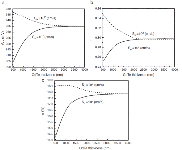 As a general observation, the best results are achieved with a low back surface recombination velocity and small thickness. It is also important to notice that for thick CdTe layers, the recombination velocity does not have a significant effect on the outcome of the cell parameters.