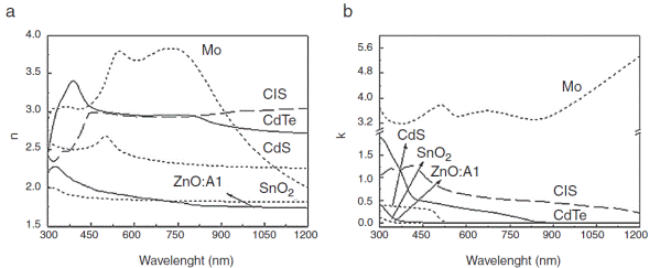 Based on this model, as well as on the values of refractive index n(λ) and extinction coefficient k(λ) reported in the literature (see Fig. 2) (Filmetrics, 2016; Mclntosh, 2016; Pan, Zhang, Teng, Li, & Li, 2008; Polyanskiy, 2016; Treharne et al., 2011), values of R(λ) were determined for the solar cells studied in this paper, as will be discussed in the next section.