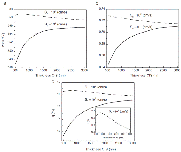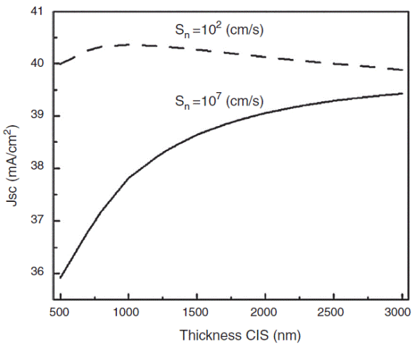 Results for solar cell efficiency when varying thickness of the absorber layer are shown in Figure 9. Notice that when the surface recombination velocity is low at the back, the optimum CIS thickness is small (around 750 nm), which is in agreement to what was explained in Section 1. Then, the material required can be reduced with the respective reduction of cost, and at the same time a high cell efficiency can be expected. Hence, it is convenient to have the reduction of the surface recombination velocity at the back, while achieving high quality absorber thin films without pinholes. These are objectives to be pursued in future CIS or CIGS and CdTe solar cells, as well.