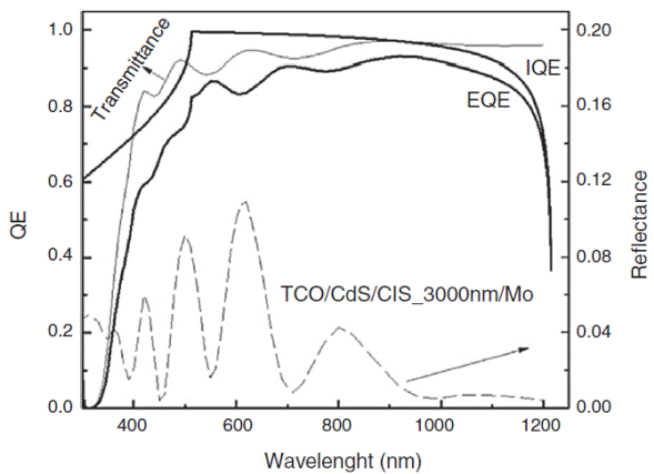 Figure 7 shows the results of internal quantum efficiency IQE(λ) and external quantum efficiency EQE(λ) as functions of the photon wavelength for a CIS solar cell with absorber layer thickness of 3000 nm and high recombination velocity at the back (107 cm/s). In Figure 7, we can see clearly that the difference between IQE and EQE is due to the optical effects associated to the optical transmittance and reflectance for the given solar cell structure (shown in Fig. 5). Particularly for wavelengths below 450 nm, the EQE is greatly reduced as a consequence of the reduced transmittance at the front layer. The J-V and P-V characteristic curves were also calculated, from which Jm , Vm and Voc , FF and efficiency (η) were determined, as shown in Figure 8.